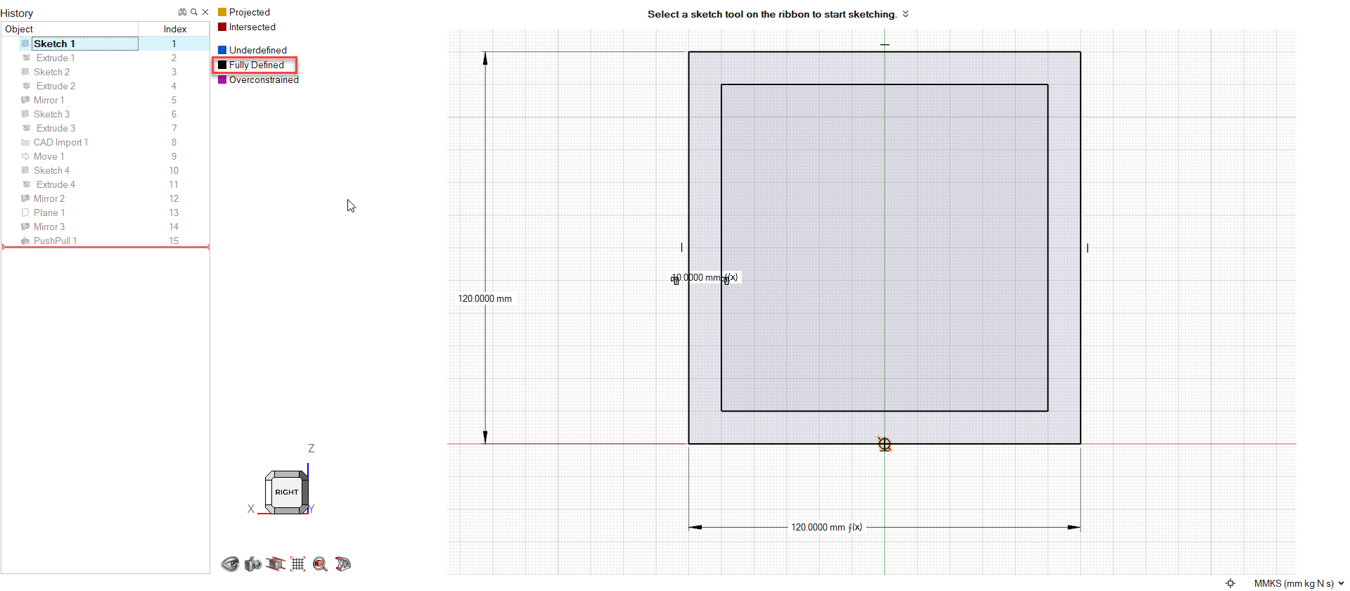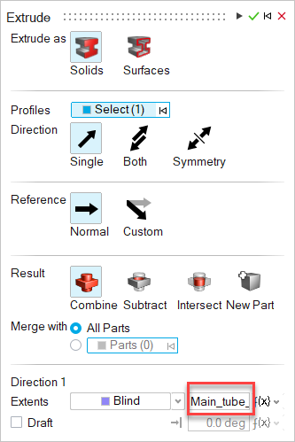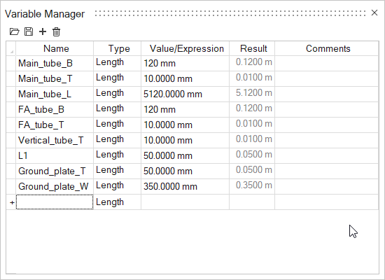 查看完全定义的几何变量 在“几何”功能区,选择变量工具。 显示“变量管理器”。这些变量是草绘时生成的。最佳实践是在创建几何变量时,确保所有零件在模型中完全约束。关于如何创建变量的详细信息,请查看视频教程:创建参数零件。 对于 Main_tube_L,请确保长度为 5120 mm。 关闭变量管理器。 按 F6 打开结构历史浏览器。。 双击 Sketch 1。该草图是黑色的,表明它为完全定义。 双击 Extrude 1。这是定义 Main_tube_L 变量的地方。要查看完整条目,在操作面板中的范围字段中点击并一直向左滚动,直至 Main_tube_L=5120.0000 mm。模型的这个部分为完全定义。 关闭“挤出”工具。 关闭结构历史浏览器。