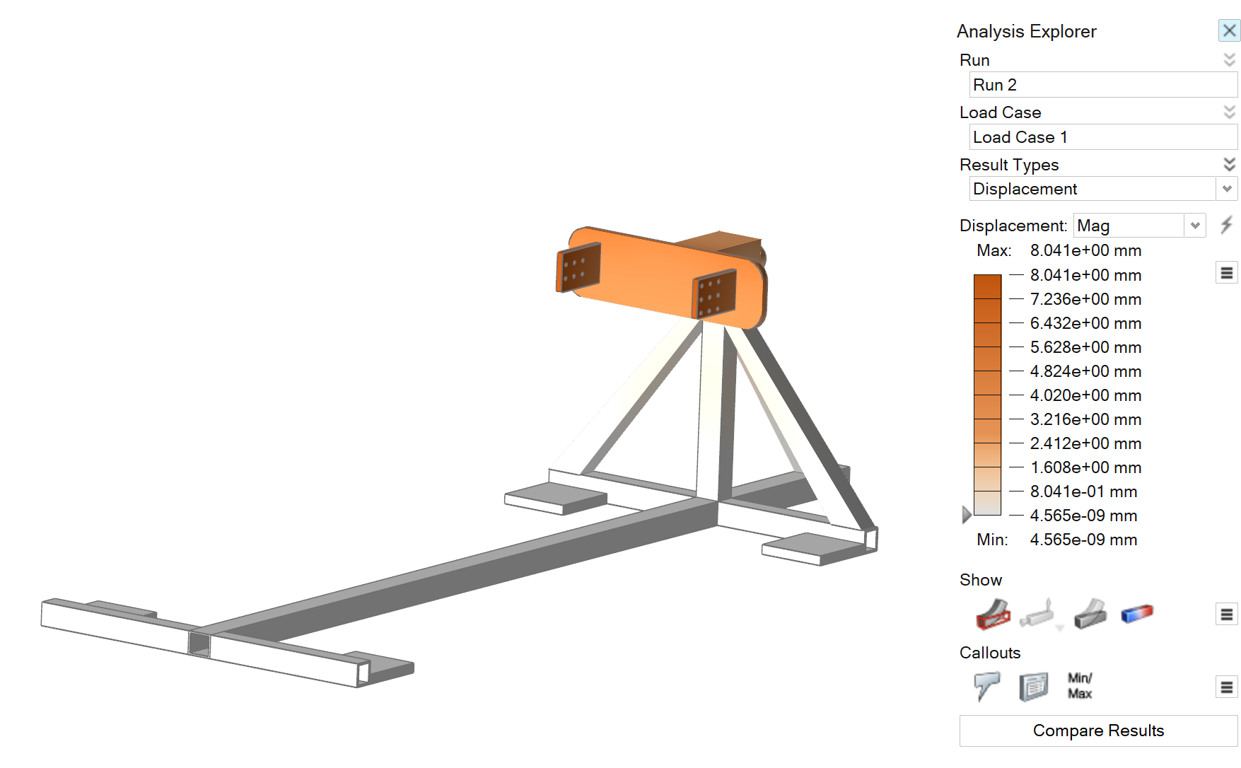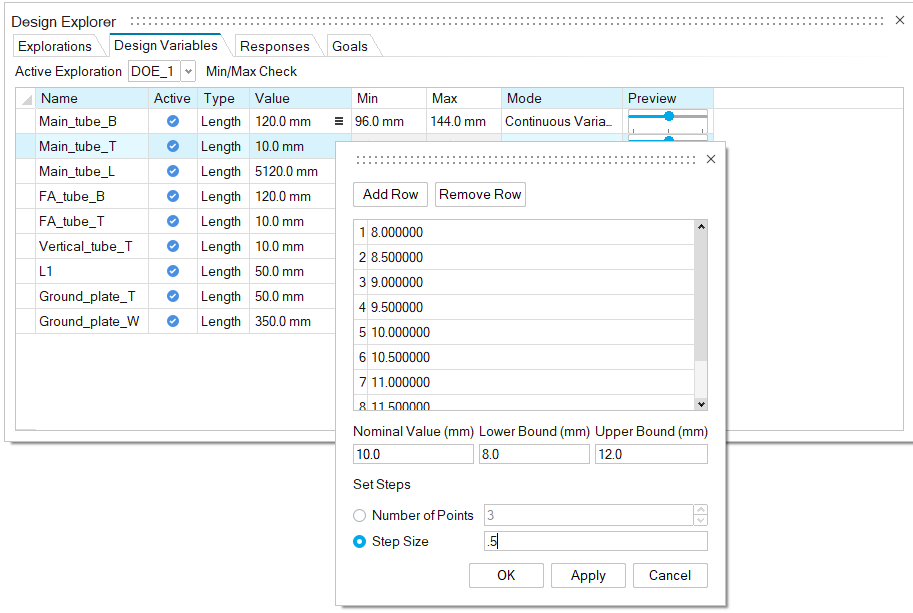 调整并查看设计变量 在“设计管理器”功能区,选择形状变量工具。 最小值和最大值将从初始变量值中自动生成。Main_tube_B=120 mm + 22.2% 生成 Min=96 mm 和 Max=144 mm。 展开“设计管理器”对话框,使“模式”列和“预览”列可见。对于 Main_tube_T ,将模式更改为离散变量。 在 Main_tube_T 行、值单元格中,选择 查看更多选项。 启用步长大小,并输入 .5。 现在您即将 Main_tube_T 的长度设置为在 8 至 12 mm 之间,以 0.5 mm 为增量。 点击确定。 要预览设计,请拖动预览滑块。您可以预览任何设计变量的最小值、最大值和公称值。 点击 Main_tube_L 的预览滑块左侧,查看该变量的最小值。注意图形区域的设计更改。 点击 Main_tube_L 的预览滑块右侧,查看该变量的最小值。注意图形区域的设计更改。 注: 当您退出“设计变量”工具时,所有变量将返回至公称值。