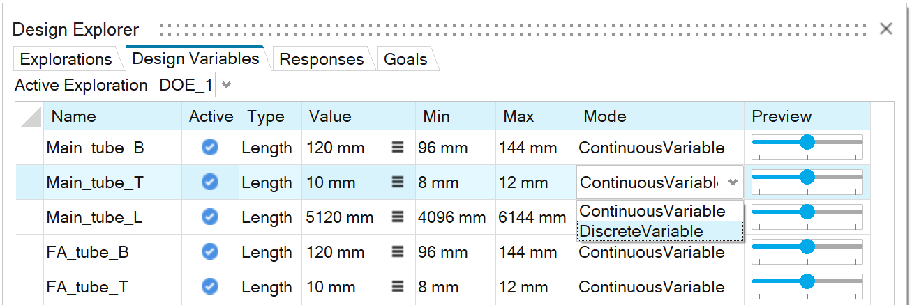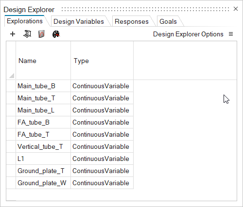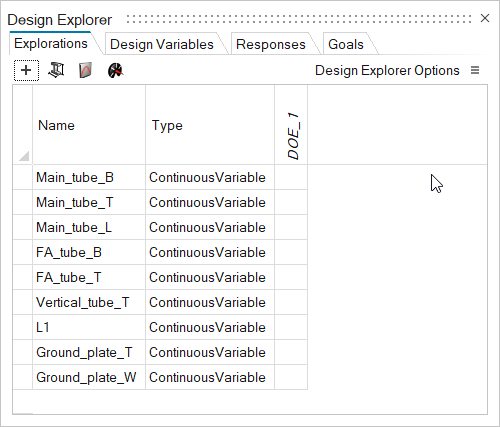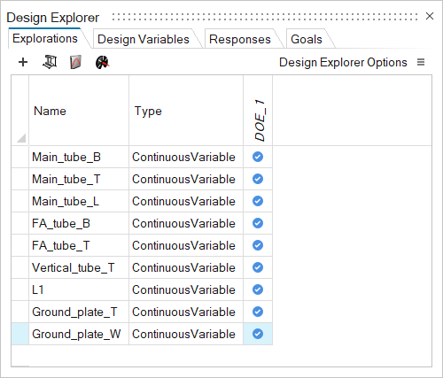 创建 DOE 并激活变量 在“设计管理器”功能区,选择探索工具。 所有未链接到其他变量的几何变量均被自动转换为设计变量。 在“探索”选项卡上,点击 + 添加探索,然后选择 DOE。 此时创建一个激活的 DOE。 在 DOE_1 下选择空单元格,以激活所有变量。 关闭设计管理器对话框。