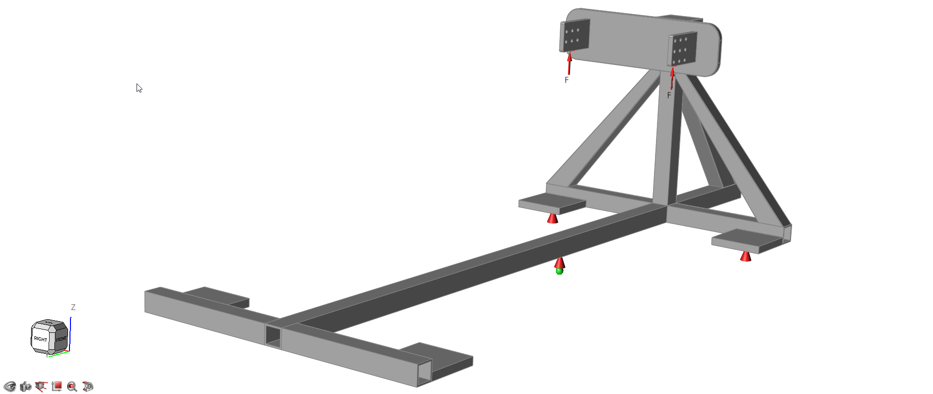 打开 DOE 模型 按 F7 打开“演示浏览器”。 在“结构仿真”文件夹中,双击 Design_Explorer_DOE_Fixture.stmod 文件,在模型视窗中加载。 模型现已加载。 选择 SimSolid 作为求解器: 在文件菜单上,点击偏好设置按钮。 在 Inspire > R运行选项 > 分析求解器下,选择 SimSolid。 在模型视窗右下角,将显示单位设置为 MMKS (m kg N s)。
