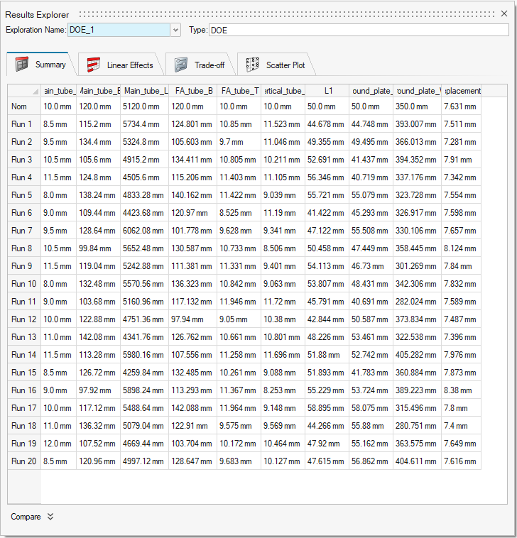 浏览 DOE 运行结果 在“设计管理器”功能区,选择结果浏览器工具。 这会打开结果浏览器。有 4 个结果选项卡:汇总、线性作用、平衡,和散布图。 选择汇总表 选项卡。 汇总表显示了逐个运行的探索总结。各列显示每次运行的输入设计变量值和相应的响应值。更多信息请见汇总表。 选择线性作用 选项卡。 线性图显示了设计变量对选定响应的模型的相对影响。数字越大,相对于其他变量,给定变量的影响就越大。效果的颜色表示给定效果是正面的还是负面的。正面效果以蓝色阴影显示,表示设计变量的正面变化会导致响应的正面变化。 负面效果以棕色阴影显示,表示设计变量的正面变化会导致响应的负面变化。FA_Tube_B 的线性作用为 -2.021,意味着管道底座宽度的增加将减少位移响应。从最小设计变量 96 mm 到最大设计变量 144 mm 的全部线性作用约为 -2 mm。 更多信息请见线性作用。 选择平衡 选项卡。 “平衡”让您能够预测不同设计变量产生的响应值,不论这些值是否使用线性作用运行。在这种情况下,您可以在范围内设置任何变量,并得到计算出的响应值。更多信息请见平衡。 选择散布图 选项卡。 散布图是一种 2 维图表,显示变量的趋势或它们之间的关系。更多信息请见散布图。 关于如何保存和导出优化后的形状,请查看导出几何和结果。