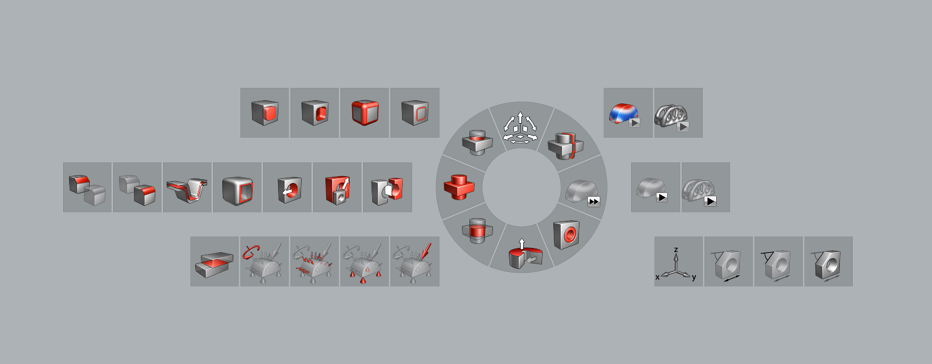 要打开工具带,请按住相应的快捷键和鼠标右键以访问快捷菜单(圆环上的工具)。然后,使用鼠标右键拖动工具以将其选中。要访问完整的工具带,请在右键点击时按住相应的快捷键,然后左键点击工具以将其选中。