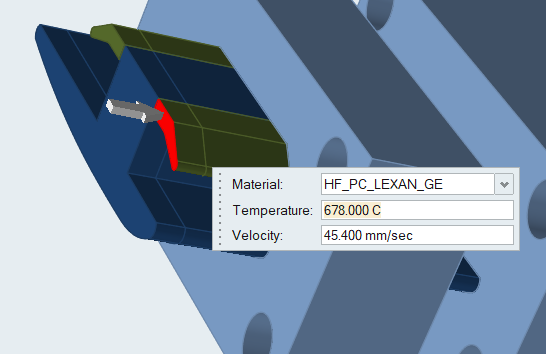 Creating Inlet Boundary Conditions Specify conditions at the surface where the polymer enters the domain. Click the Calibration tab. Click the Inlet icon. Select an inlet surface for a layer. Select the material, temperature, and velocity of the input. Repeat for each polymer layer.