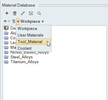 In the Material Database dialog, to the right of , click the triangle and select Tool_Material.