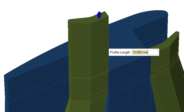 Inspire Extrude will create a Profile solid and use 3 times the length of the Land as default. You can change this if needed. We recommend the profile solid length be 3-4 times the actual land region. In this model, use 12 mm for the profile length.