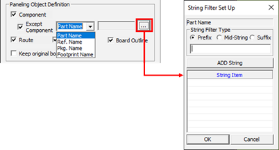 • Edit: Edit the settings saved board in the table list. Select a board to edit from the list and modify the setting in Mirror, Rotation, Paneling Object Definition, Paneling Object Area and Placement.