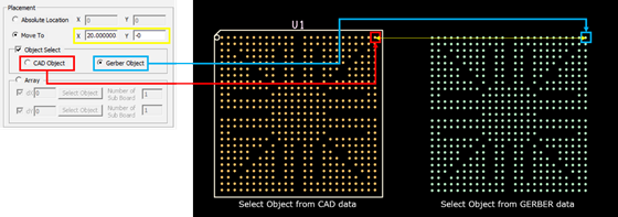 • Object Select: Automatically calculate the movement coordinates by selecting the pad of the PCB data and the pad of the Bare Board Gerber (Metal Mask) data in an array.
