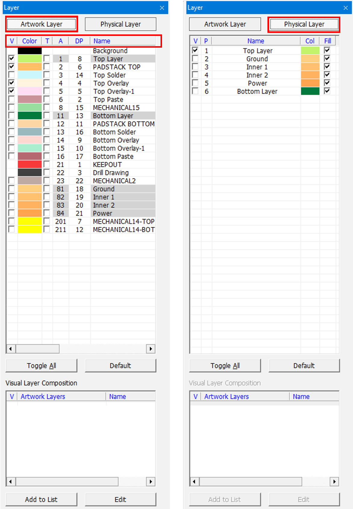 In PollEx PCB, there are two types of layers: artwork and physical layer.