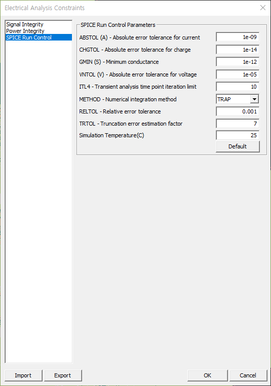 You can specify PollEx Spice’s simulation control parameters which will affect the simulation time, accuracy, and convergence characteristics.