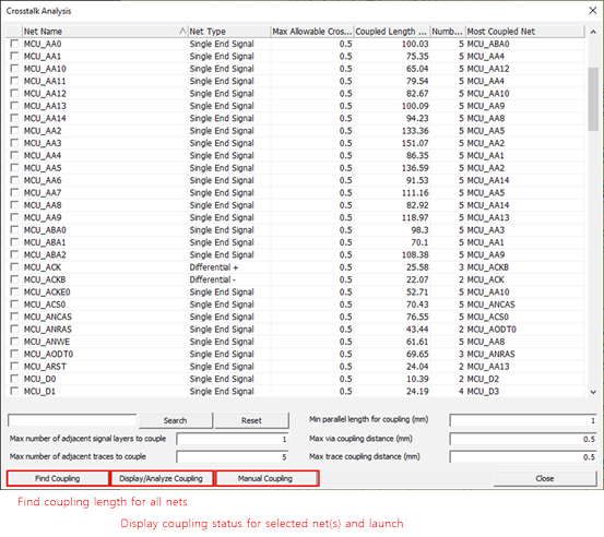 Crosstalk Analysis menu allows you to analyze the crosstalk effect among closely coupled nets. Upon selecting the menu entire signal nets are listed. In certain degree entire nets in the PCB design have crosstalk coupling with each other. However, it is not only practical but also not necessary to analyze a lot of coupled nets together since crosstalk noise between far apart lines or short parallel lines is not significant. Separation amount and parallel line length are used as criteria for identifying closely coupled nets for the analysis. The crosstalk coupling control parameters include the maximum number of adjacent signal layers, maximum number of adjacent traces, minimum parallel trace length, maximum parallel via distance, and maximum parallel trace distance.