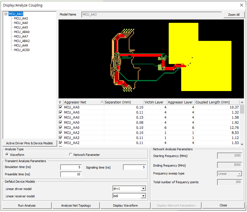 From the menu bar, click to execute waveform and network parameter analysis for the selected net(s) considering the coupling effects by neighboring nets. When you specify the victim net, the strongly coupled nets are automatically screened through whole PCB layers. The coupling parasitic will be extracted and configured as SPICE circuit for the crosstalk analysis.