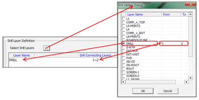 - Drill Connecting Layers: Specify the drill layer connecting physical layers as starting and ending layers in the Drill Setting dialog.