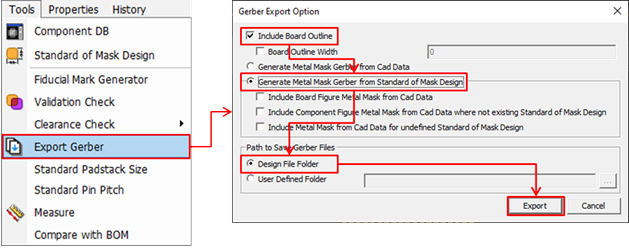 From the menu bar, click Tools > Export Gerber.