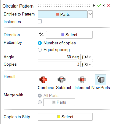 - PartsNote: To make all of the parts in the pattern instances of the original part, turn on Instances.