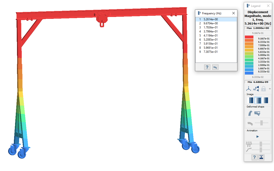 The Legend window opens and displays the contour plot. The Frequency (Hz) window opens and displays the modes. You can cycle between the frequencies to view their mode shapes.