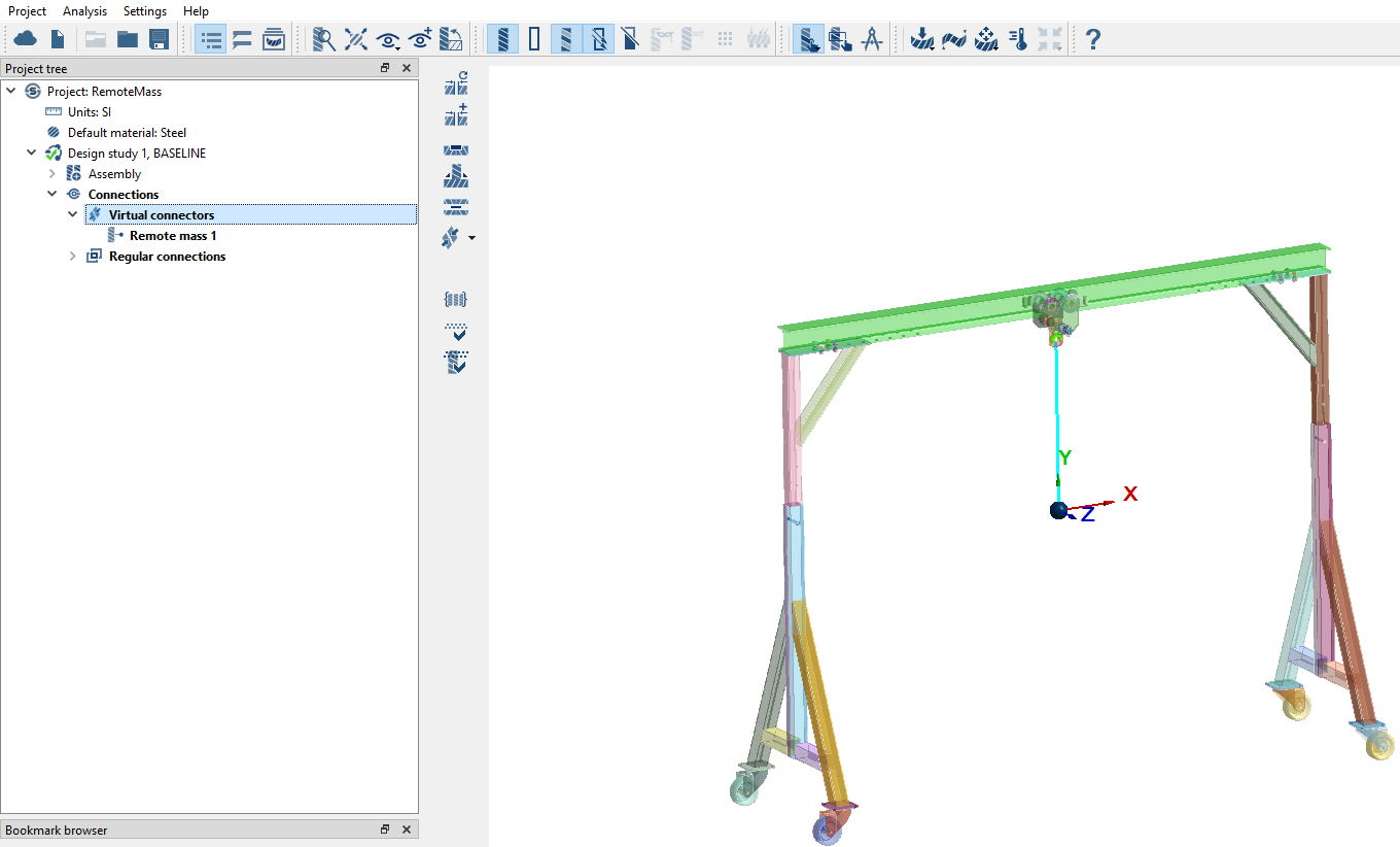 The Remote Mass is listed under Connections > Virtual Connectors in the Project Tree. It is shown in the modeling window as a point mass at the specified coordinates.