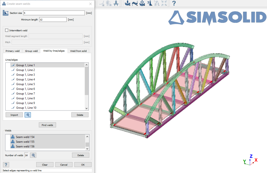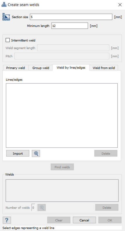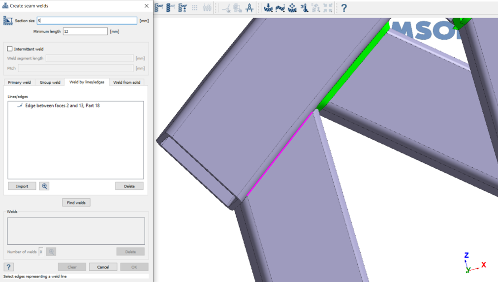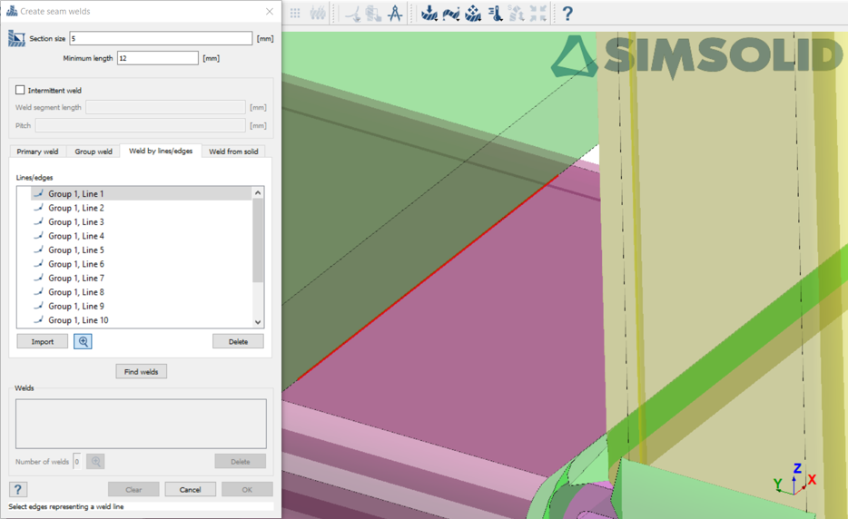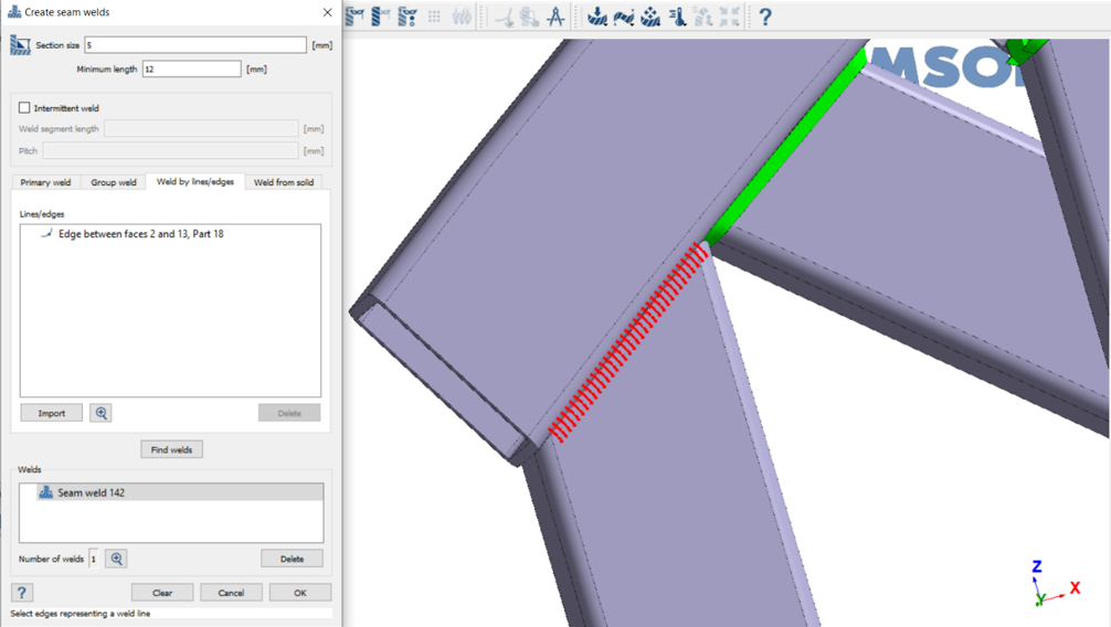 从导入的直线创建缝焊 在连接工具栏,点击 (缝焊)。 选择按直线/边查找焊缝选项卡。 点击导入。 图 23. 在文件浏览器中,选择 SeamWeldLines.xml,然后点击打开。 导入的直线在对话框的“直线/边”部分列出,并绘制在 模型视窗 中。 图 24. 点击 ,可以更仔细地查看这条直线。 被选中的直线会以红色高亮显示。 点击查找焊缝。 查看焊缝,然后点击确定接受焊缝。 图 25.