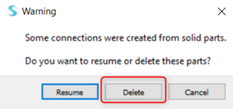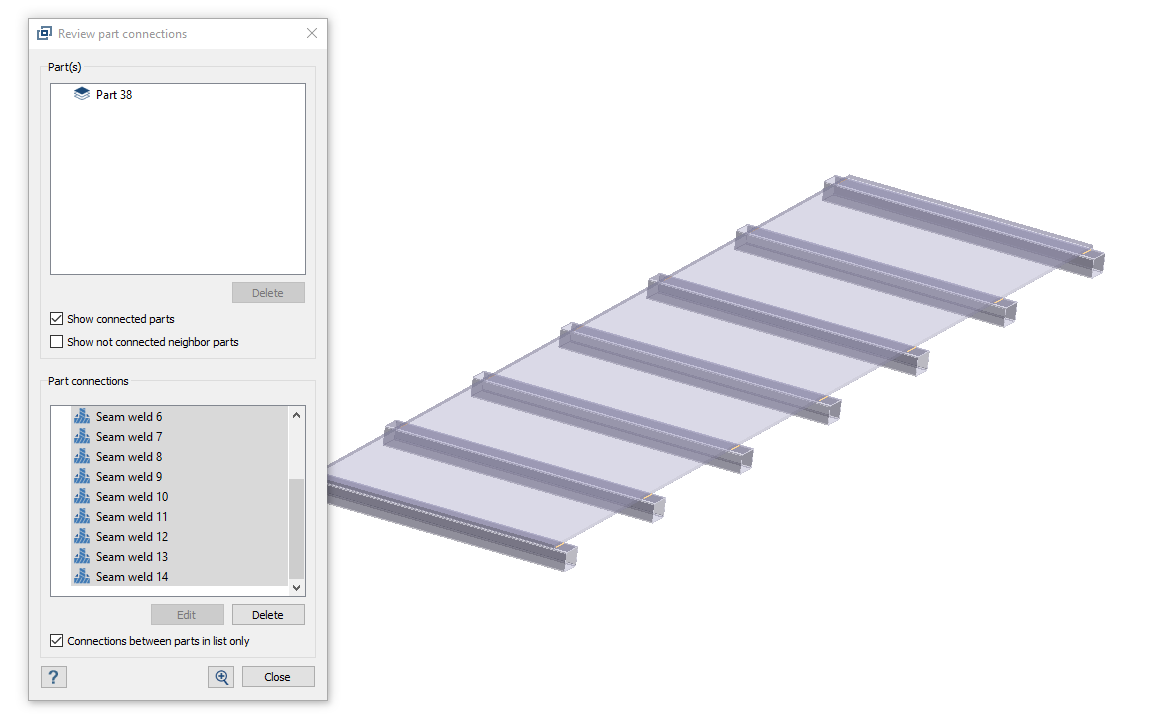 查看焊缝 右击通道,然后在右键菜单中选择查看零件连接。 图 19. 选中零件的所有连接都会在对话框中列出。 在对话框中,选择所有缝焊。 图 20. 点击删除。 在第一个警告对话框中,点击确定。 图 21. 在第二个警告对话框中,点击删除零件。 从中创建焊缝的零件被删除。 图 22.