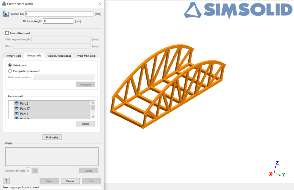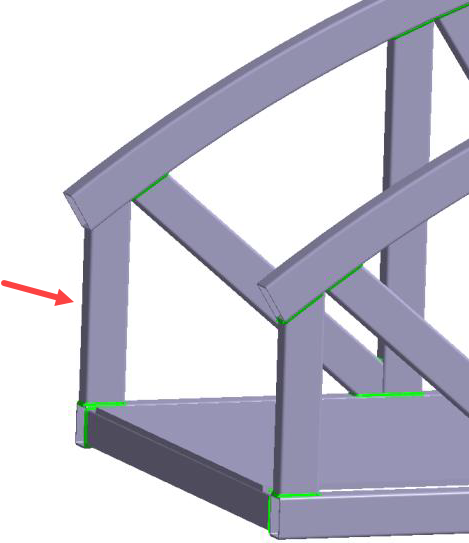 使用组焊缝创建焊缝 在对话框中,切换至组焊缝选项卡。 将截面尺寸设置为 5 毫米。 将最小长度设置为 12 毫米。 在模型视窗中,隐藏桥接的通道部分,然后选择其余零件。 图 8. 点击查找焊缝。 将显示找到的焊缝的预览。 图 9. 点击确定。 图 10.