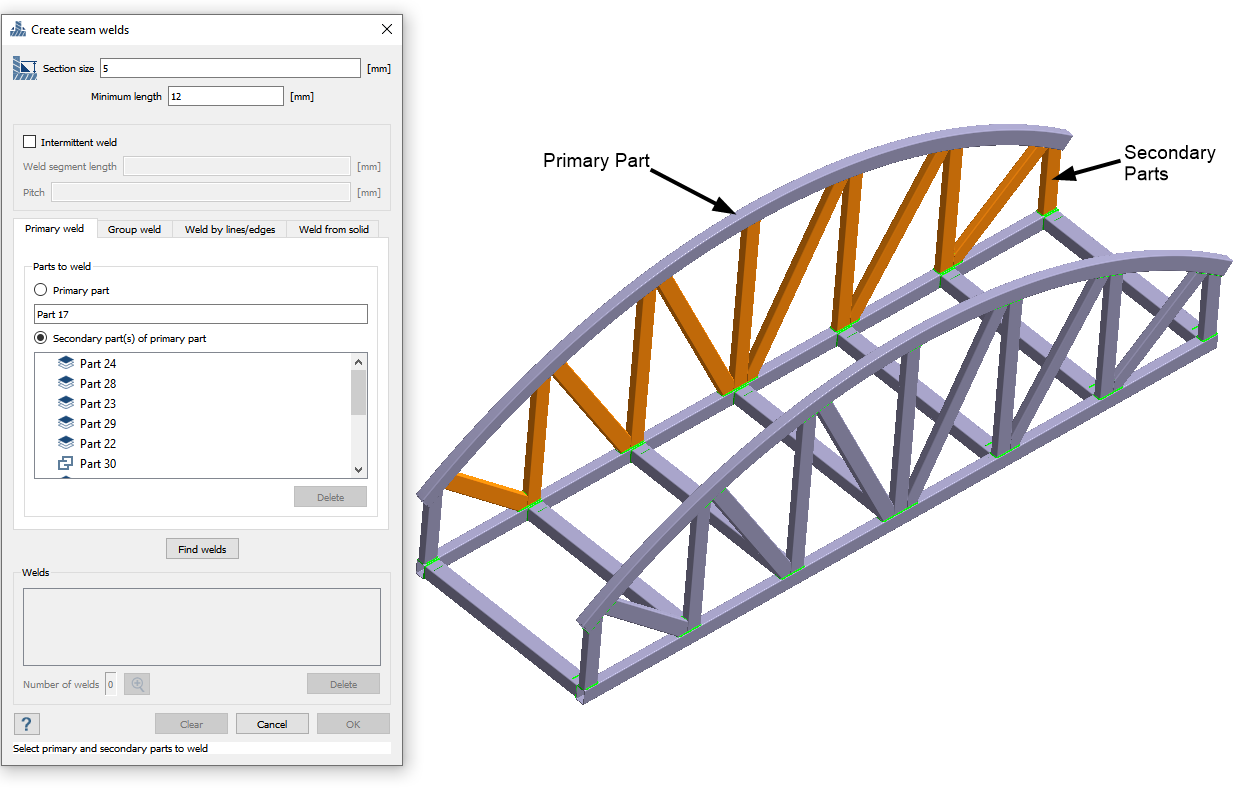 使用主焊缝创建焊缝 在对话框中,切换至主焊缝选项卡。 将截面尺寸设置为 5 毫米。 将最小长度设置为 12 毫米。 激活主零件单选按钮。 在模型视窗中,选择弧线。 在模型视窗中,选择 图 13 中显示为橙色的零件。 图 13. 点击查找焊缝。 将显示找到的焊缝的预览。 图 14. 点击确定。