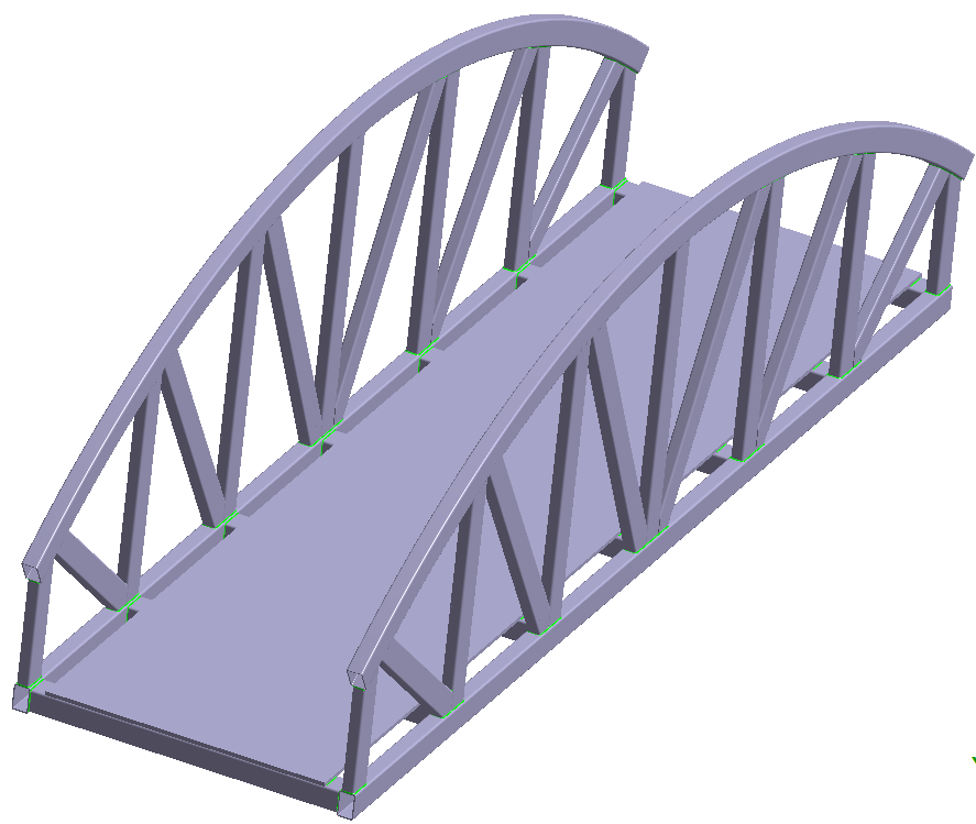 导入几何模型 启动新 SimSolid 会话。 点击从文件导入 。 在打开几何体文件对话框中,选择 Foot Bridge_solid_parts.x_b。 点击打开。 装配将加载到模型视窗中。此时将打开自动连接对话框。 点击取消关闭对话框。
