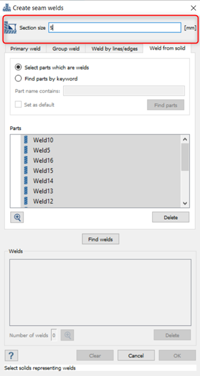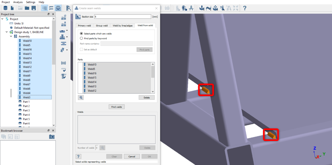 从实体创建缝焊 在项目树上,点击连接工作台 在工具栏,点击 > 创建新的缝焊。 在对话框中,选择来自实体的焊缝选项卡。 将截面尺寸设置为 5。 图 2. 截面尺寸定义了从焊趾到焊缝根部的长度。 图 3. 采用下列方式之一选择零件: 在项目树中,扩展装配分支,然后选择在 图 4 中高亮显示的零件。 图 4. 在创建缝焊对话框中,选择按照关键词查找零件单选按钮,然后输入焊缝。然后点击查找零件。 选择模型视窗中的零件。 选中的实体零件会在模型视窗中高亮显示。 图 5. 点击查找焊缝。 对话框中将显示找到的焊缝的预览。 图 6. 点击确定。实体焊缝是通过抑制创建它们的实体零件来创建的。被抑制的实体零件将从项目树中删除。 图 7.