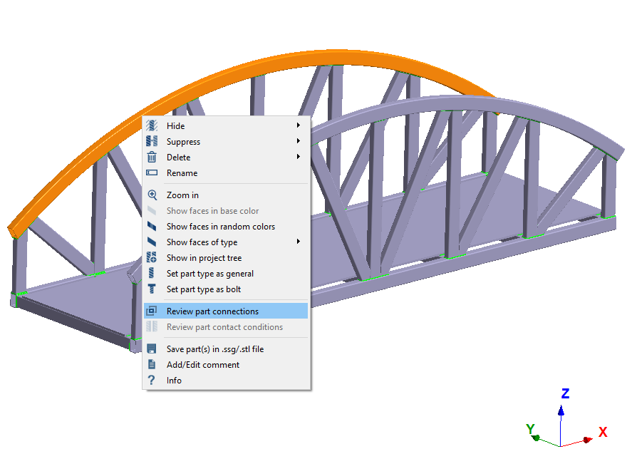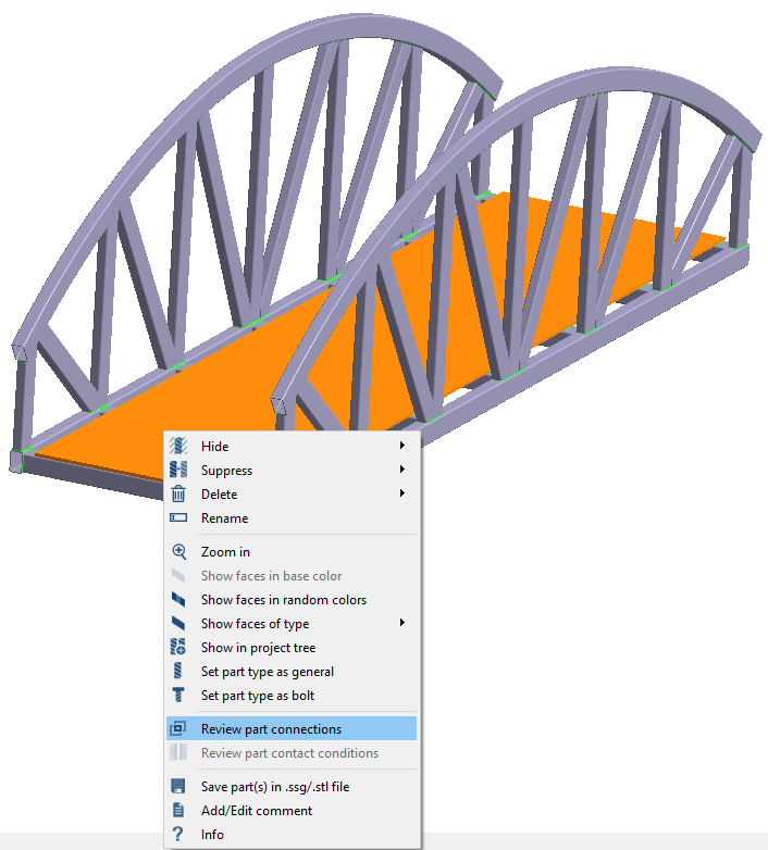 查看连接并删除缝焊 在模型视窗中,选择 图 11 中显示为橙色的弧线。 右击零件,然后在右键菜单中选择查看零件连接。 图 11. 与零件相关联的所有缝焊都会在对话框中列出。 在对话框中选择所有连接。 点击删除。 图 12. 点击关闭,退出对话框。