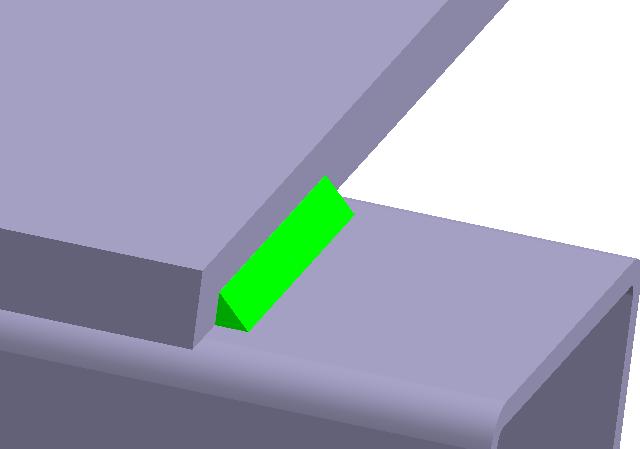 使用直线/边创建焊缝 在模型视窗中,放大 图 15 中显示的零件。 图 15. 在对话框中,切换至按直线/边查找焊缝选项卡。 将截面尺寸设置为 5mm。 将最小长度设置为 12mm。 在模型视窗中,选择 图 16 中显示为粉色的边。 图 16. 点击查找焊缝。 将显示找到的焊缝的预览。 图 17. 点击确定。 图 18. 重复步骤 2 至 7,在此零件的其他边上创建焊缝。