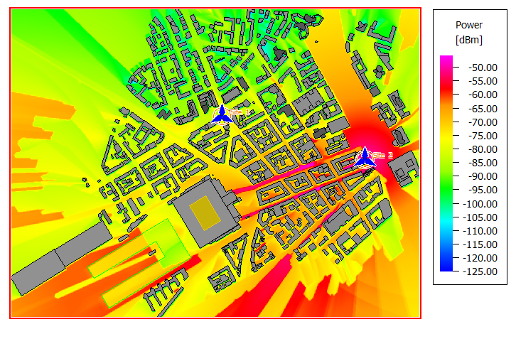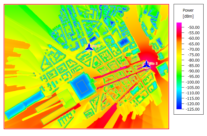 Figure 3. Power calculated for Site 2 Antenna 3 using the dominant path model (DPM). The Fill Buildings display setting is disabled.
