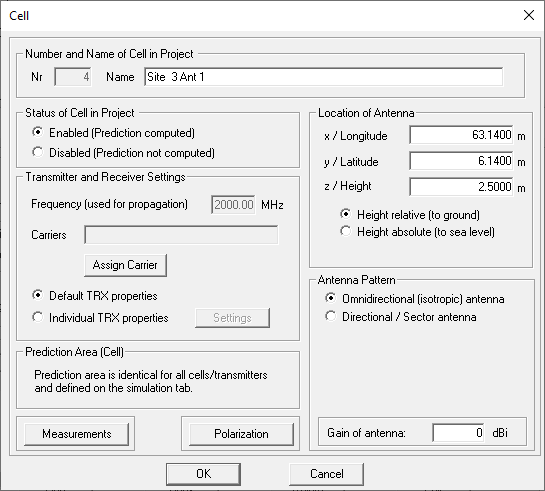 Define the third site, place the third omnidirectional antenna at this location, and assign a carrier. The antenna is placed at a height of 2.5 m above ground.