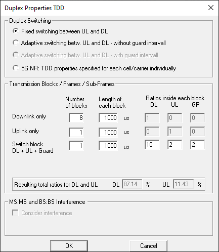 The TDD properties specified for each cell/carrier individually radio button is active when a 5G TDD air interface was selected when creating the project. In that case, TDD settings are defined individually for the specified carrier in each cell. This is done on the Carrier dialog when assigning a carrier to a transmitter. For 5G NR TDD, the Carrier dialog will offer fields for symbols per slot (number of downlink, uplink and flexible symbols).
