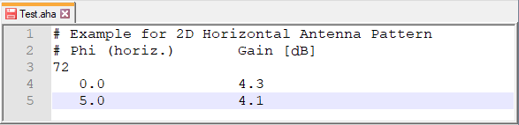 In contrast to the proprietary binary files, the ASCII antenna pattern file (.apa) can also be edited using a simple ASCII editor.