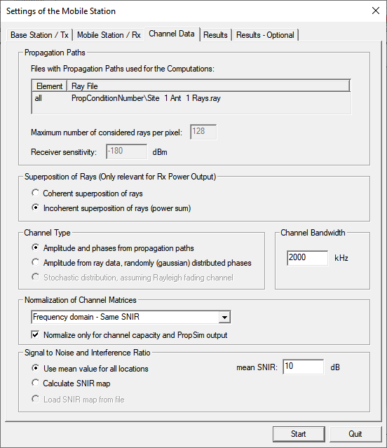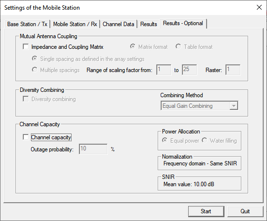 The normalization mode for the MIMO channel capacity has to be chosen, depending on the way you intend to compare the calculated capacities. For a comparison based on the same SNIR, you have to choose Same SNIR. Other options in the drop-down list include Path Loss. The mean SNIR to be considered during the channel capacity calculations has to be specified, too.