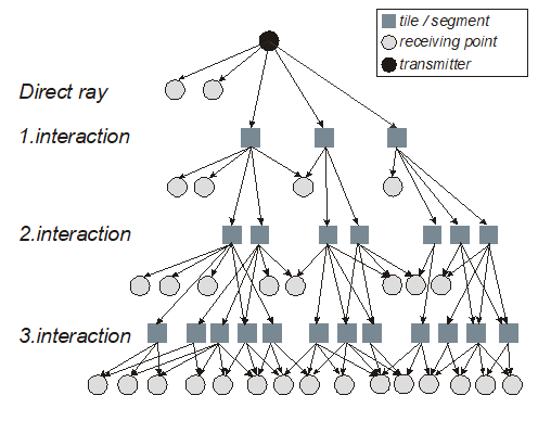 The result of the preprocessing of the building database is a tree structure containing tiles, segments and receiving points of the prediction area, for example, as indicated in Figure 3. In this tree, every branch symbolizes a visibility relationship between two elements.