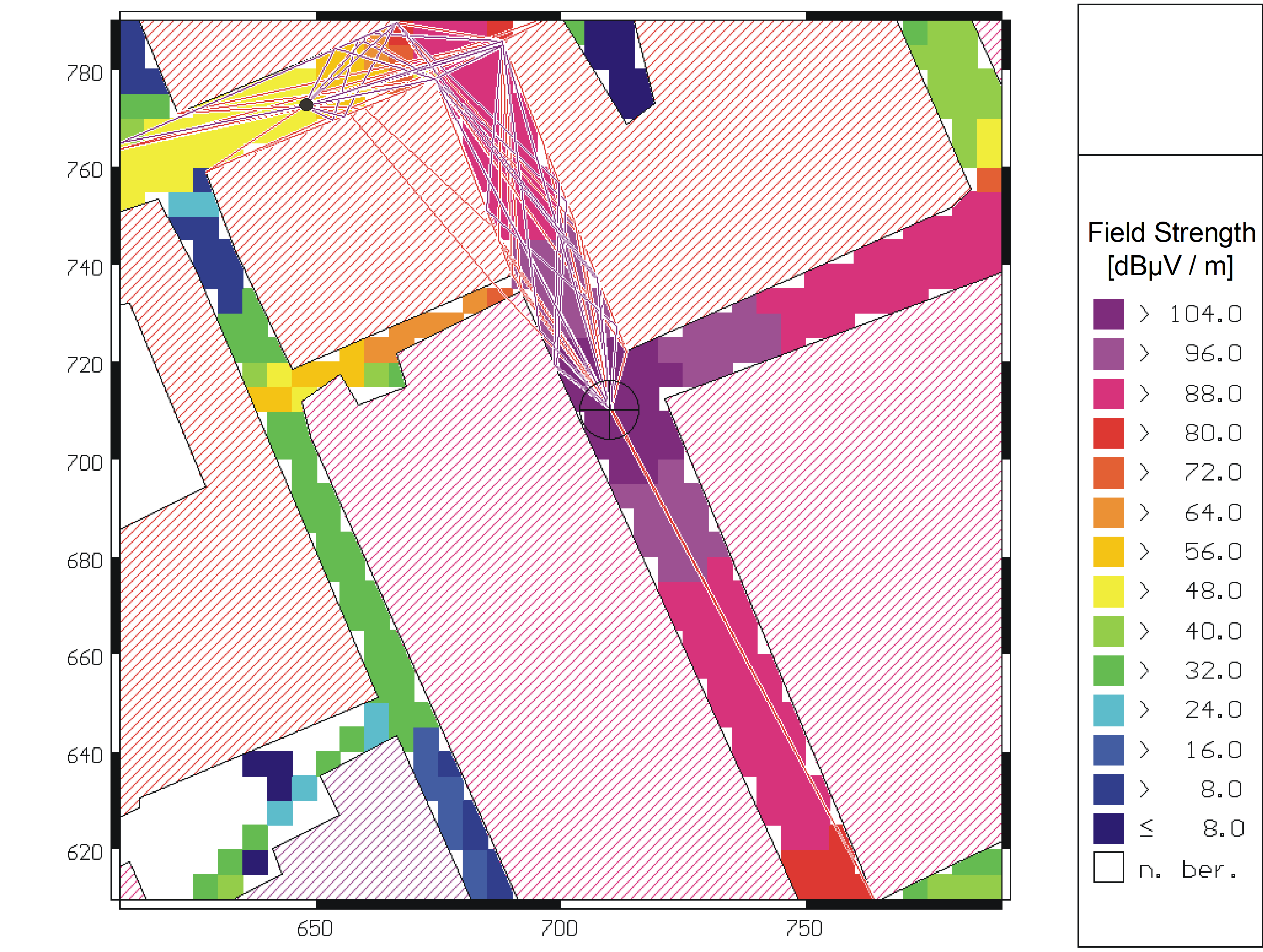 Due to the restriction to two orthogonal planes, this approach has better computational performance but at the cost of a slightly reduced accuracy - not all buildings are taken into account for the determination of ray paths.