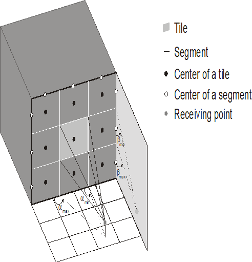 If the receiver visibility relations are determined in the preprocessing, the only remaining visibility relations to be computed in the prediction are the ones from the transmitter to the tiles (of walls and prediction grid) and segments. Figure 2 depicts the visibility relations between a tile and a receiving point. For the calculation of the angles, the connecting straight lines between the receiving point and the four edges of the tile are considered.