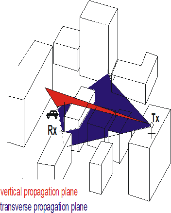 From the many transmitter-to-receiver propagation paths, the most dominant ones have to be selected to obtain the total received power with moderate computation time. A useful acceleration of the process of ray pathfinding under the consideration of the main propagation mechanisms is the limitation to two orthogonal planes (double 2D). Rooftop diffracted paths are included in the vertical plane approach, while for buildings the diffracted paths are modeled with the transverse plane approach as depicted in Figure 5. The propagation in both the vertical and the transverse plane is considered in two dimensions. However, the determination of the building corners in the transverse plane is not necessarily performed in a horizontal plane. This principle can also be considered for the intelligent ray-tracing approach which leads to the following two 2 x 2D models included in ProMan: